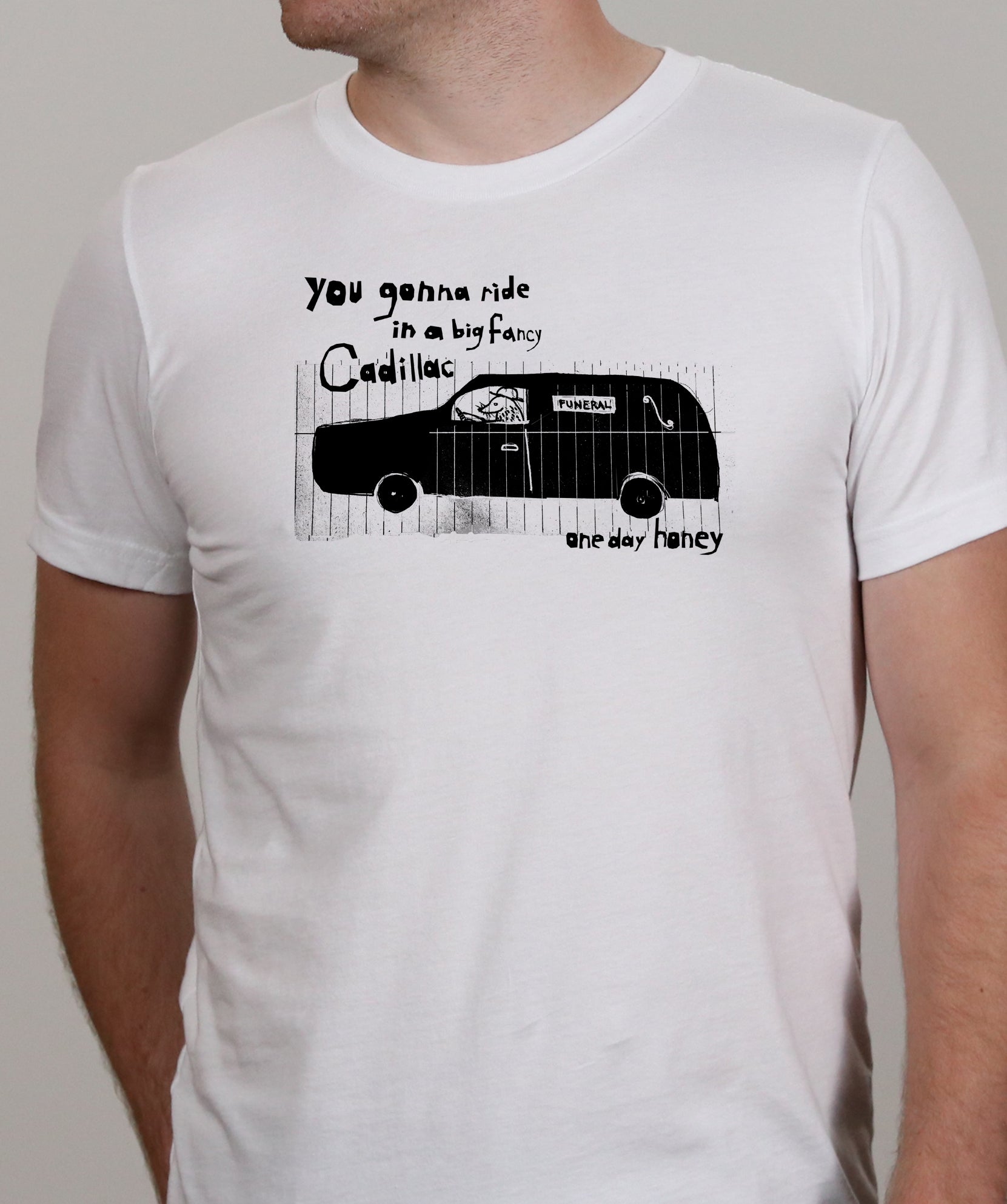 Hand-screened blank ink on a white 100% cotton tshirt.